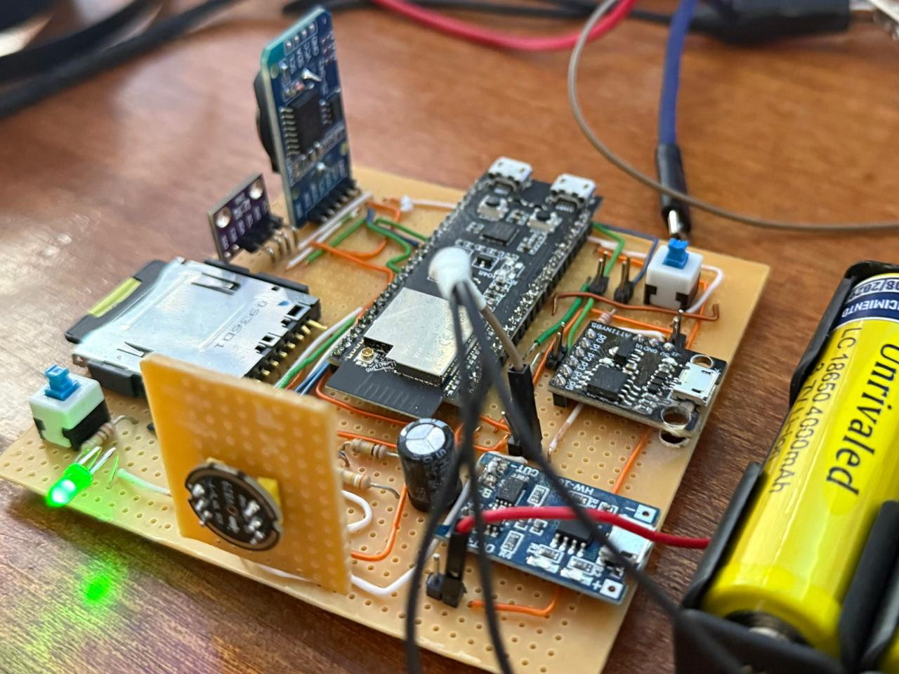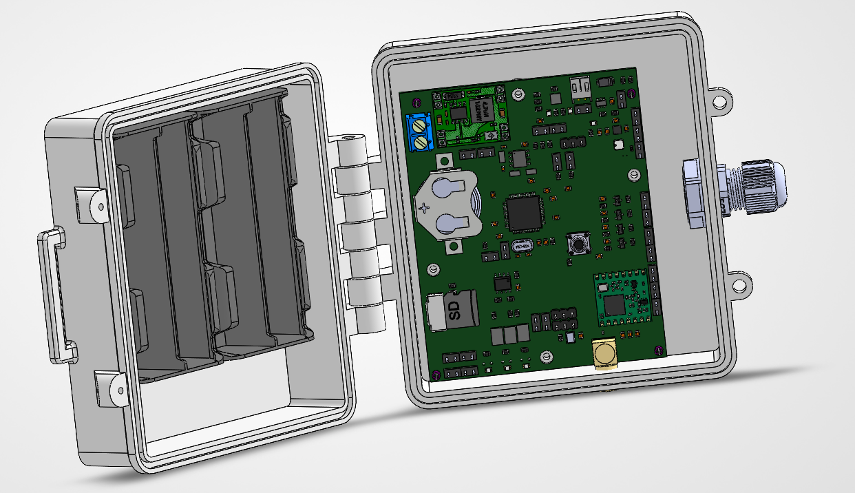 The project evolved into a dedicated PCB, designed specifically for this use case rather than being adapted from generic boards. The focus was on energy-efficient architecture, with battery-based power supply, the ability to incorporate solar panel charging, and careful selection of low-power components.